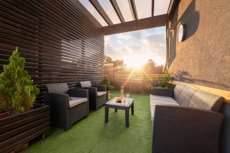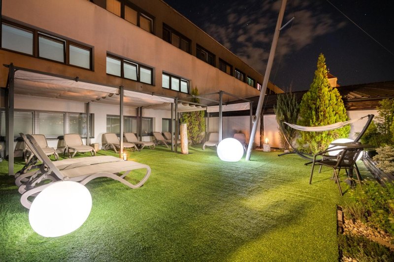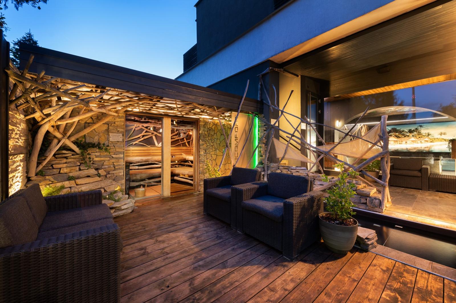 - Venkovní patrová terasa s jezírkem a posezením (v létě možnost opalování na sluneční terase)